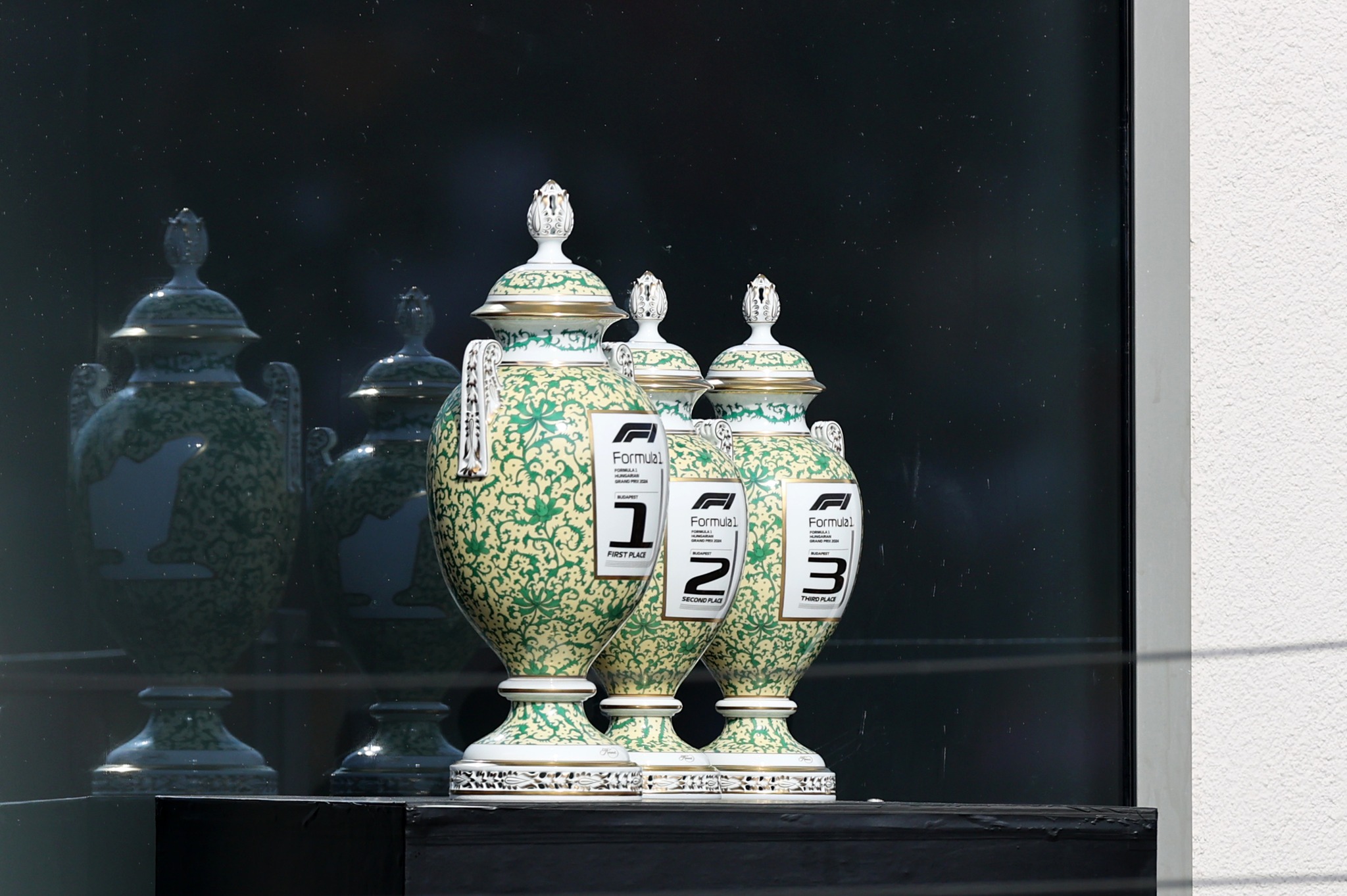 A Forma 1 díjak dekorálásának alapjául egy távol-keleti Herendi minta szolgált. Ez a különleges minta a „Császári bazsarózsa” („Pivoine imperiale”) nevet viseli, amely egy stilizált zöld rózsa, növényi indákkal és levelekkel. A trófeák testét bézs alapszín (fond) borítja. A díjak tükrében a Magyar Nagydíjra utaló Hungaroring sziluettje került elhelyezésre.